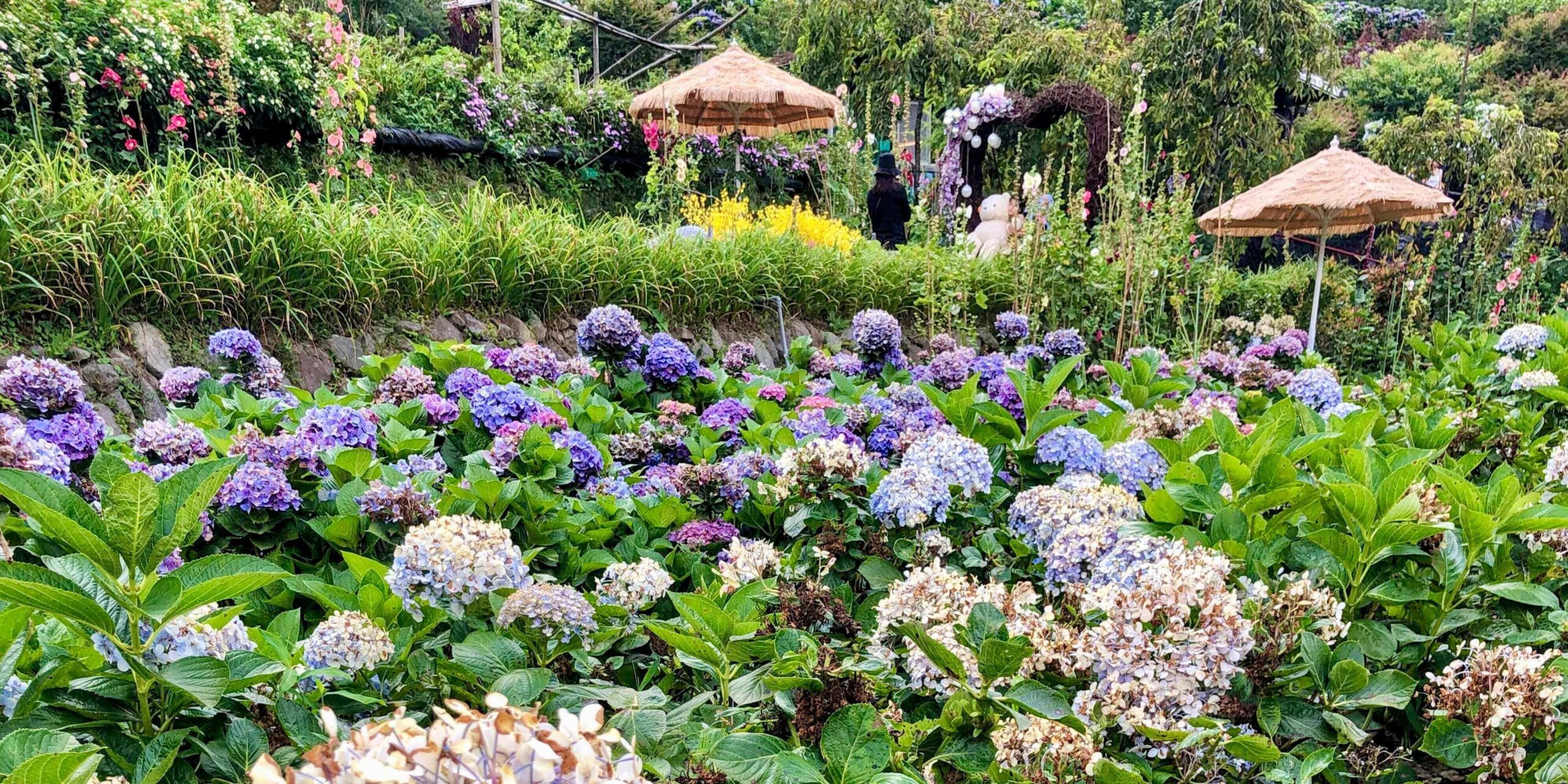 五月下旬,浪漫的白色海芋花海逐漸進入尾聲,緊接著是在端午連假盛開的紫藍色繡球花。竹子湖地區種植的繡球花約有7至8個品種,顏色多樣化,有純白色、粉色滾紅邊、粉紅色、紫紅色、淺藍色、藍色等色系;外型則同時有大輪花、中輪花分布在農園中,而且色彩濃豔、層次豐富,增添繡球花千變萬化的風采,相當適合拍照留念。